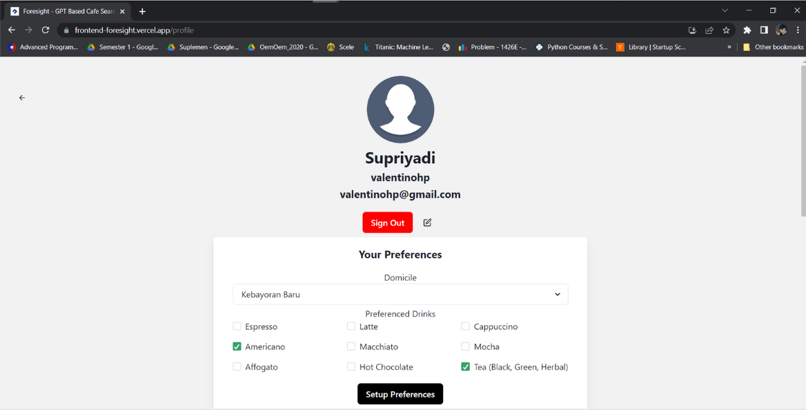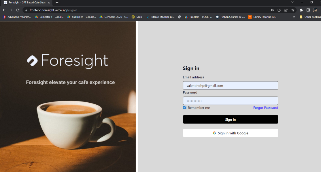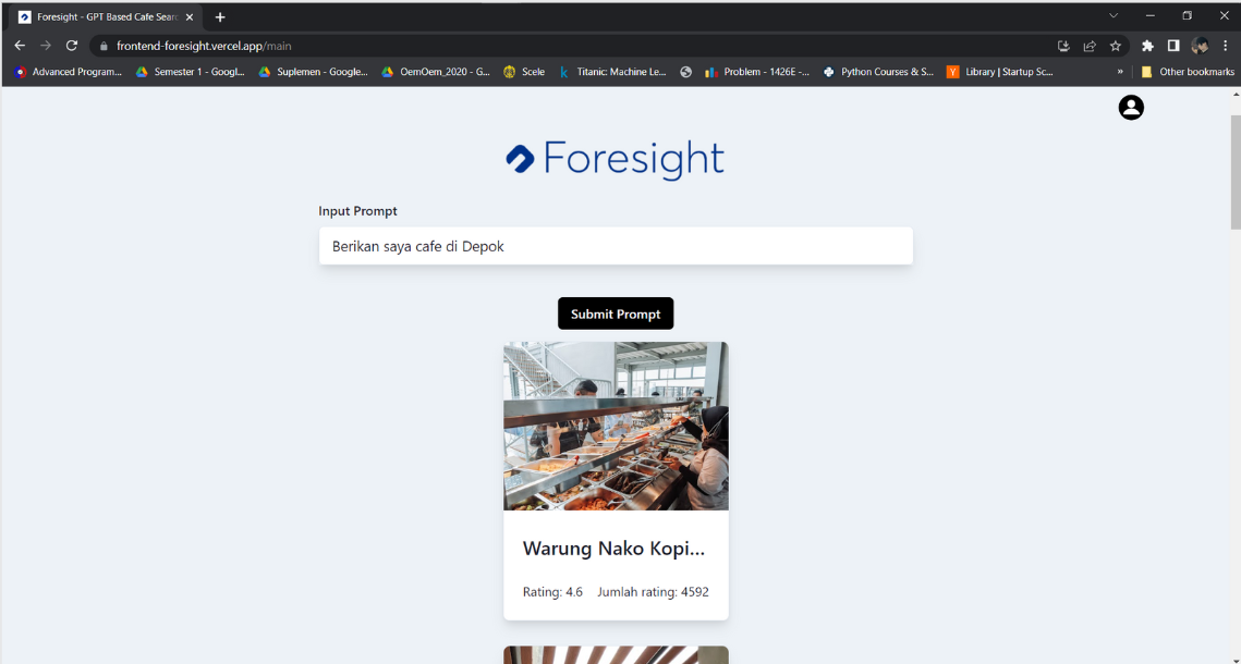 Foresight is a cafe recommendation application that utilizes the GPT-Based Cafe Searching Platform. With this platform, users can easily discover the best cafes in their area, saving time and effort in finding dining establishments that align with their preferences. The key feature is a search engine integrated with the OpenAI API (ChatGPT), which processes the input prompts entered in the search bar. Subsequently, the generated list of cafes is further processed using the Google Maps API to obtain details about each cafe, such as ratings, location, price range, and more.